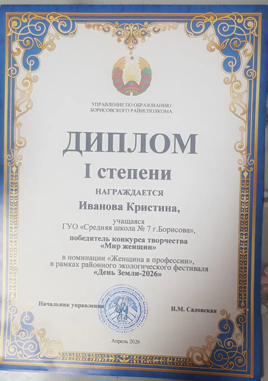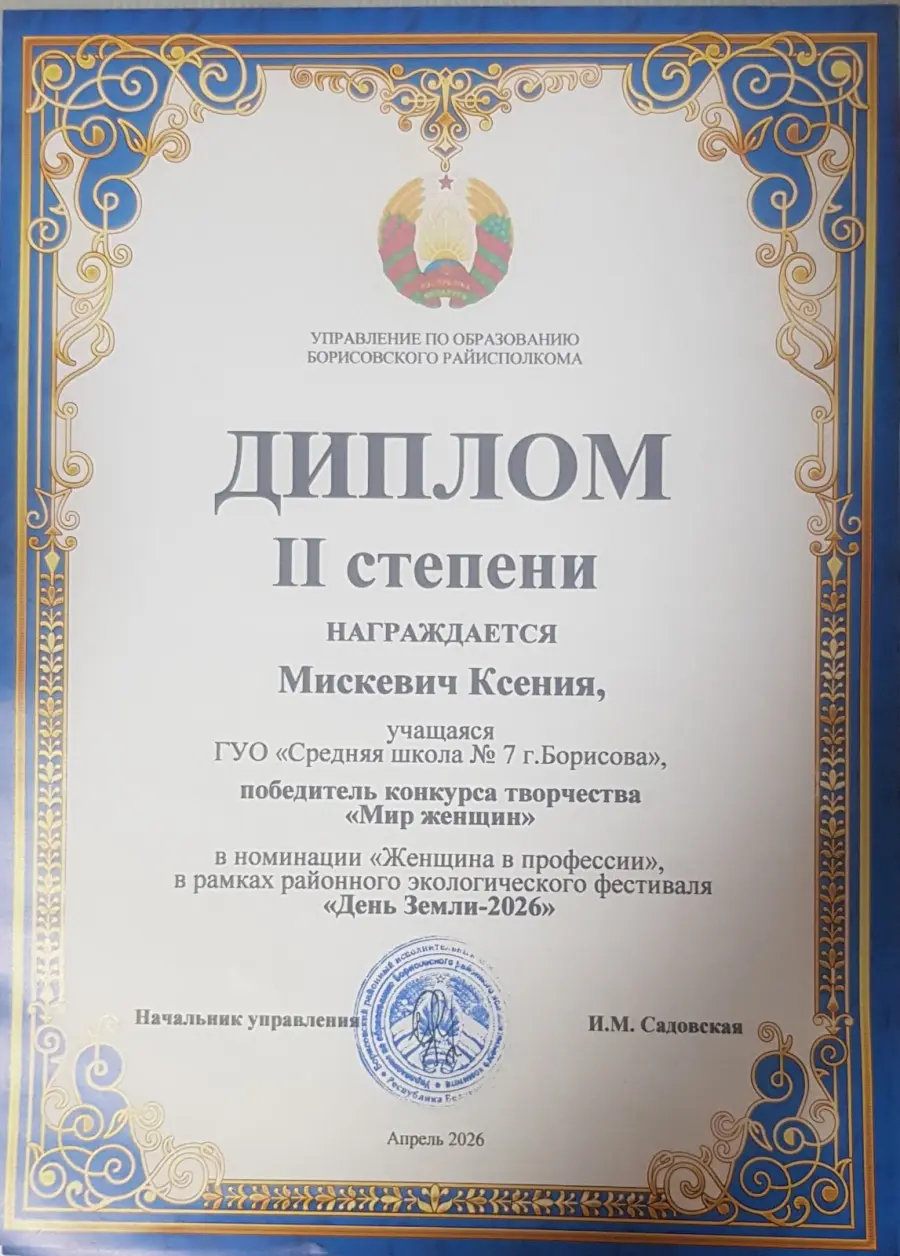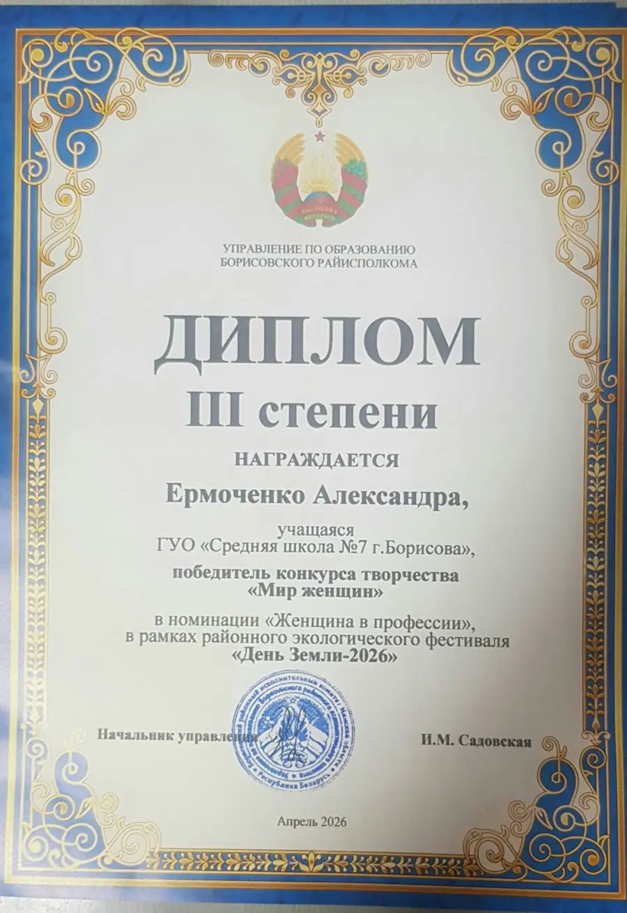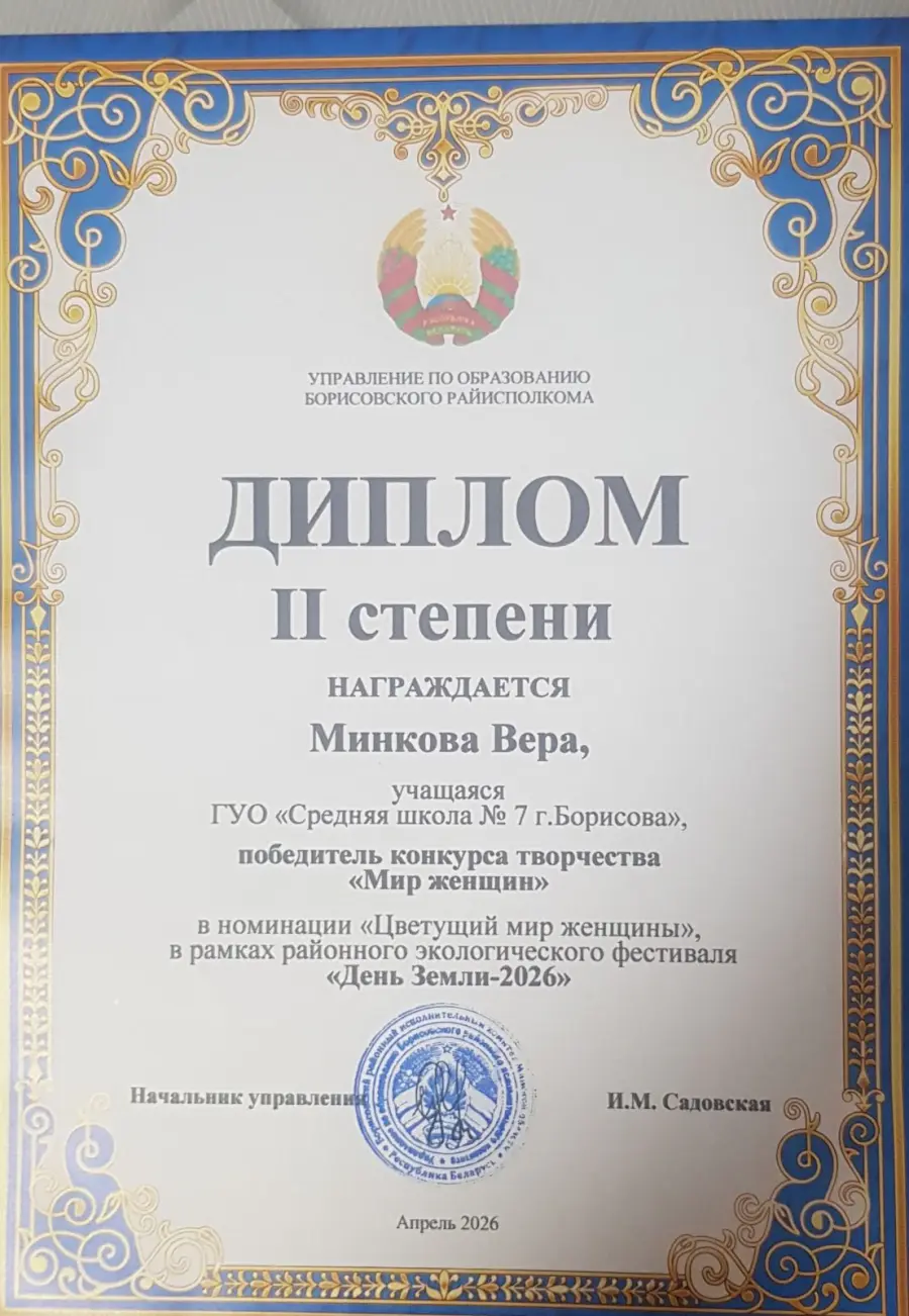 25 апреля в актом зале ГУДО «Борисовский центр экологии и туризма» состоялась церемония награждения участников районного экологического фестиваля «День Земли - 2026». Поздравляем учащихся нашей школы: Ивановну Кристину, Ермоченко Александру, Мискевич Ксению, Минкову Веру с достойным участием в конкурсе. Поздравляем.