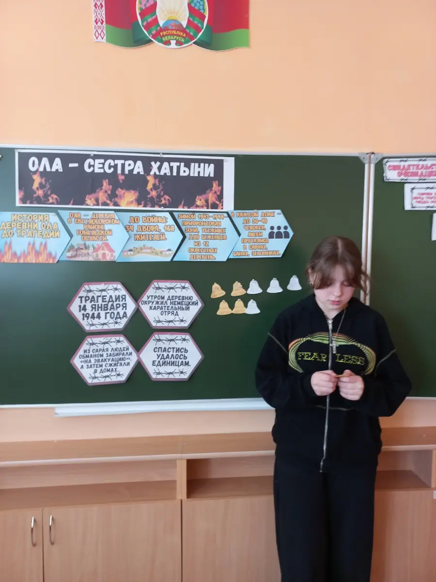 14 января в 5 "Б" классе прошёл классный час, приуроченный к трагедии в деревне Ола. Классный руководитель напомнил ребятам о геноциде белорусского народа в годы Великой Отечественной войны. Из рассказа учителя ребята узнали, что 14 января 1944 года, ранним утром немецкий карательный отряд окружил деревню. Оккупанты с нечеловеческой жестокостью запустили жернова смерти, которые не пощадили ни стариков и женщин, ни самых маленьких. Олу сожгли дотла. Стариков и детей живыми бросали в огонь, а тех, кто выбегал из пламени, убивали. Спастись из этого фашистского ада смогли единицы. В деревне Ола погибли 1758 человек, среди которых 950 детей, 508 женщин, 100 мужчин и 200 стариков. Теперь на карте страны нет такого населенного пункта, однако в мае 2020 года был возведен и открыт мемориальный комплекс на месте деревни. Такие мероприятия формируют у подрастающего поколения понимания ценности человеческой жизни и мира, отрицательного отношения к насилию.