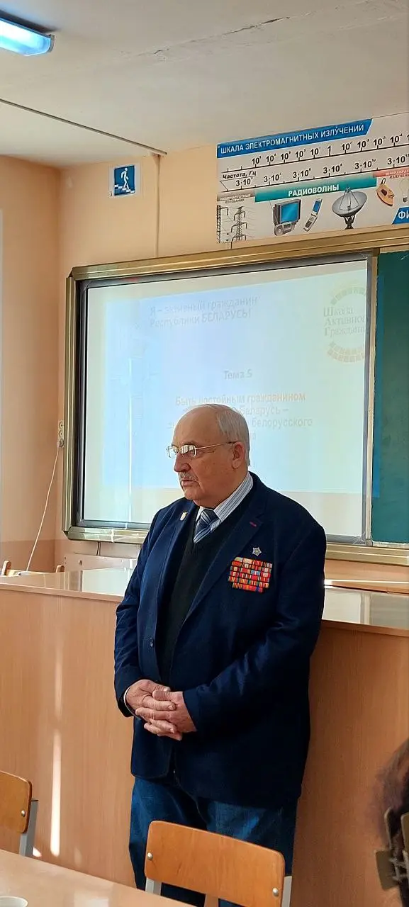 Александр Сергеевич стоял у истоков создания военно-патриотических классов в нашей школе, проработал в этом направлении 20 лет, примерно столько же прослужил в Вооруженных Силах Республики Беларусь. И сегодня Тарасов А.С. не сидит дома. С удовольствием приходит к ребятам, не пропускает ни одного праздника родной дивизии, неоднократно был приглашен во вьетнамское посольство как воин-интернационалист. Его активная жизненная позиция - пример нашим ребятам. Нашему гостю было что сказать патриотам.