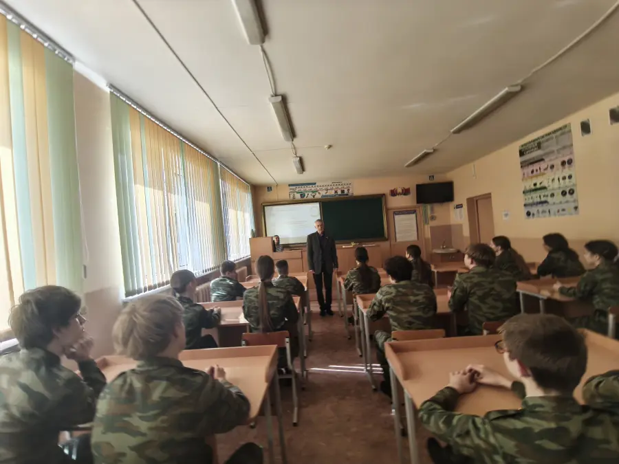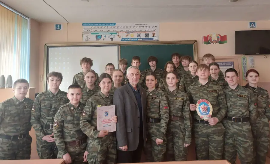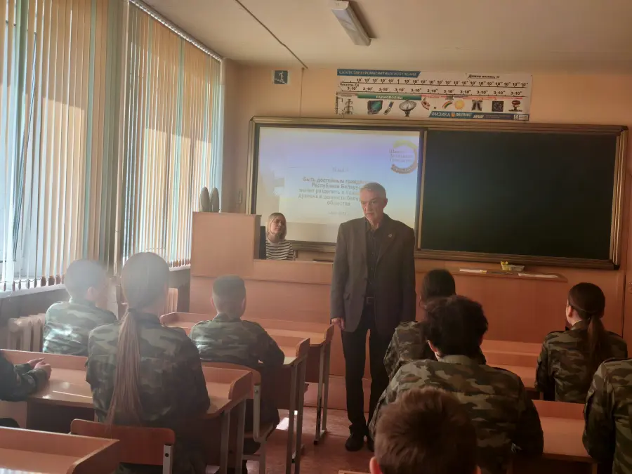31.03.2026 в рамках реализации республиканского информационно-образовательного проекта «Школа Активного Гражданина» с учащимися 9 «Б» военно-патриотического класса Государственного учреждения образования «Средняя школа №7 г. Борисова» встретился заместитель председателя Берисовской объединенной организационной структуры ДОСААФ Миронов Александр Николаевич